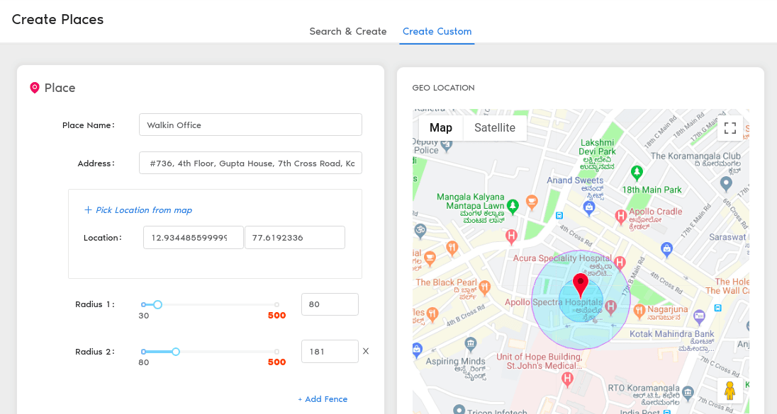 curl -i -X 'https://dev-api.getwalk.in/nearx/api/create-geofence/' \ -H 'Content-Type: application/json' \ -H 'token: <<SampleToken>>' -D '{ "geofenceInput":{ "geofenceName":"CCD", "location":{ "lat": 12.9131684 "lng": 77.6498837 } "radii":100, "address":"CCD in HSR", "area": "HSR", "city": "Bangalore", "state":"KA", "country":"India" } }'Geofences can be uniquely referenced by their ID, assigned by NearX when a geofence is created.